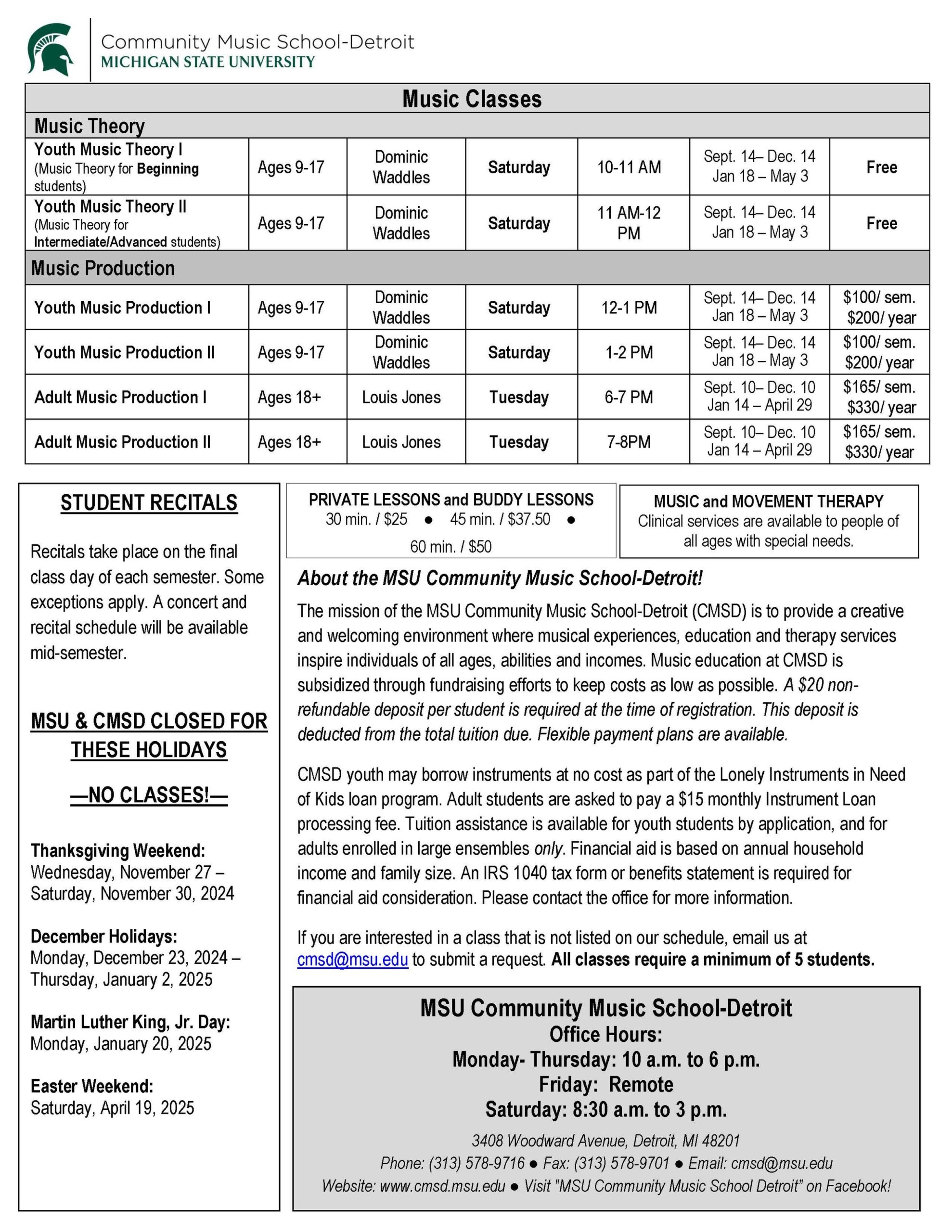 Fall registration is now open! Classes will fill quickly, so be sure to secure your place! For a limited time, students/families who pay in full for the full 2024/25 school year will save money on their registration fees! Registration for all classes will be available in-person, by phone: (313) 578-9716, or online at https://commerce.cashnet.com/msu_8018